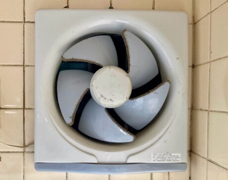 プロペラファンは、扇風機のような羽根が回転するシンプルな構造で、パワフルに空気を吸い込んで屋外へ排気します。