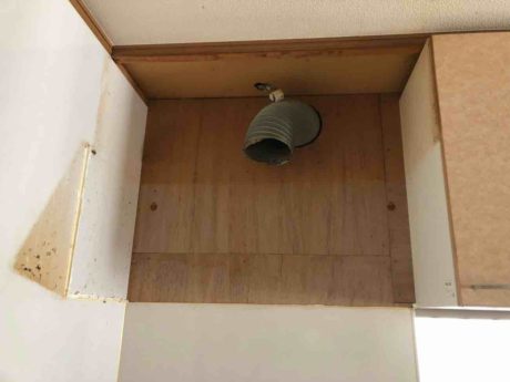 レンジフードが付いていた所の汚れを掃除し、新しいレンジフードを取り付ける準備をしていきます。