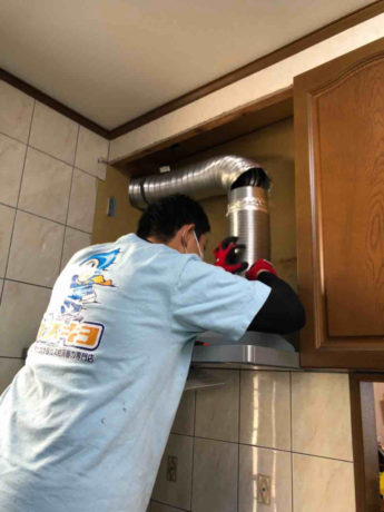 既存のフードを取り外し、換気ホースもしっかりと位置を調整、