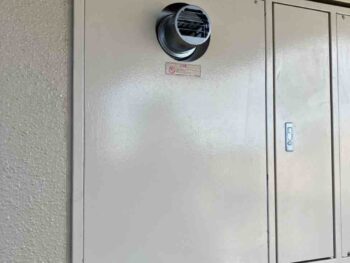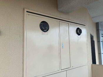 マンションの通路などに面した壁に埋め込まれている「PS(パイプスペース)」の内部に設置された給湯器のことです。