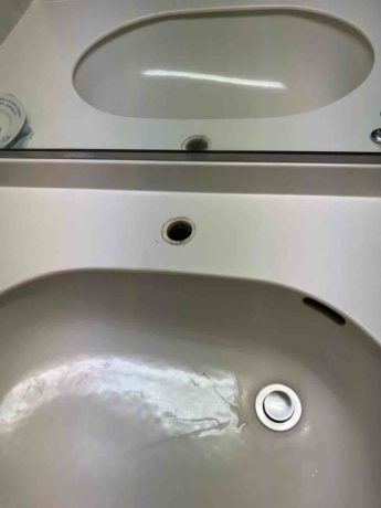 洗面台についている汚れを落としてから、新しい水栓を設置していきます。