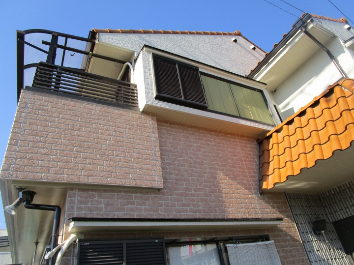 | 一階は可愛らしいレンガ柄、二階は清潔感のある真っ白なサイディングボードで全体的にポップな印象に仕上がりました。 | 別角度から見ると、より一層色味の変化が分かりやすく感じられます。 施工前の暗い印象から生まれ買ったようにお洒落になりました。 |