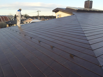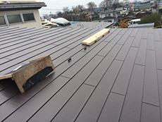 | 施工後の屋根です。施工前は汚れや錆、塗装の剥げで斑になっていた屋根がすっかり綺麗になりました。 | 雪止めもしっかり行い、耐候性も十分な屋根になりました。 |