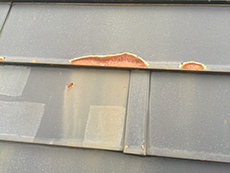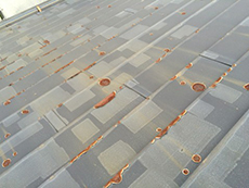 | 施工前の屋根全体の様子です。塗装が剥げたりして表面が斑になっているのが確認できます。 | 200坪はある建物の屋根なので、角や入り組んだ箇所も多くありました。 | 屋根材には点々と錆が発生していました。このまま放置し続ければ、いずれ雨漏りの原因に繋がります。 |