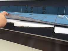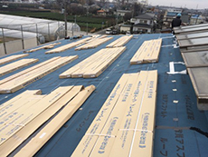 | 新しい屋根材の下地で、既存の屋根をカバーしていきます。 | 下地を隙間なく敷き詰めたら、屋根材を屋根の上に上げ、職人の手で貼っていきます。 | 新しい屋根材が次々に貼られていきます。角や入り組んだ部分も隙間なく屋根材を敷き詰めていきます。 |