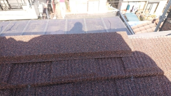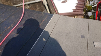 | 今回の施工ではカバー工法を行いますが、塗装で埋まってしまった既存スレート屋根材の塗膜を切る縁切りを施していきます。 | スレート屋根材の塗装では、屋根材の間に塗料が入り込みぴったりと埋まってしまうことがあります。 |