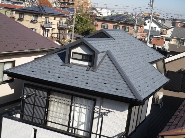 | こちらが施工後のY様邸、屋根のお写真です。 カバー工法に使用したオークリッジスーパーは、軽量ながらも超高耐久を誇る先進的な屋根材となります。 |