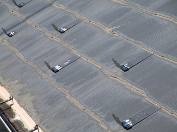 | 大屋根の全面にてルーフィング材の下葺き作業が完了となります。 | ここからいよいよ、金属屋根材によるカバー工法を行っていきます。 |